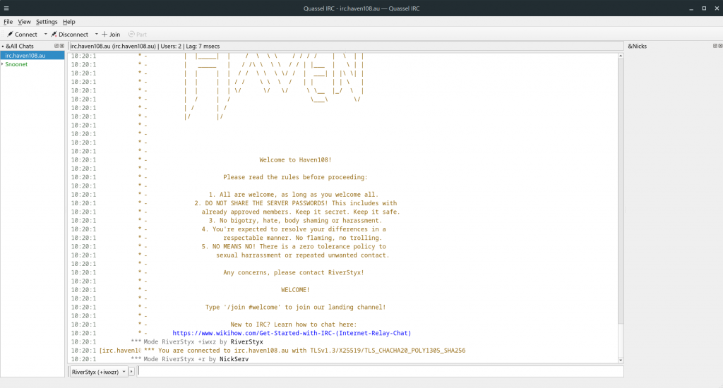 There are two parts to IRC: the server, and the client. A server is hosted remotely, and will usually look something like irc.somename.com. In this instance, our server is going to be irc.haven108.au, although you do not need to connect to this server.